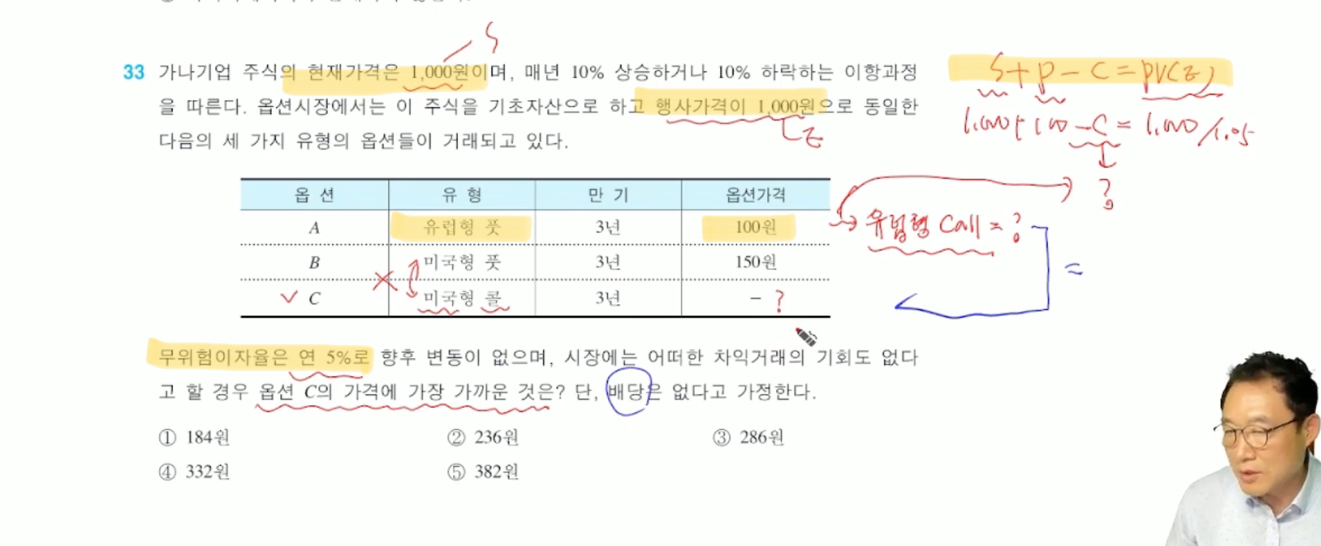 =현재가격 1,000원 + 유럽형 풋 옵션가격 100원 = C + 행사가격/(1+005)
